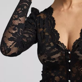 Elegant Lace Mesh V-Neck Blouse with Puff Sleeves