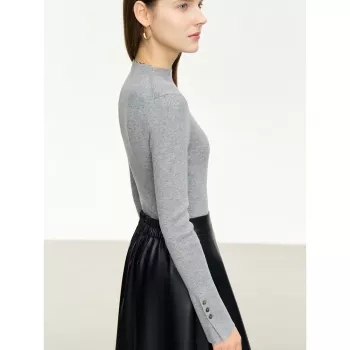 Minimalist Mock Neck Sweater with Slit Cuffs and Metal Buckle for Women