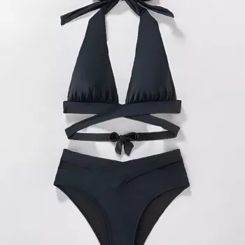 Sexy Black Halter Cross High Waist Bikini Set – Hollow Out Two Piece Swimsuit